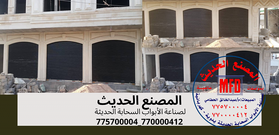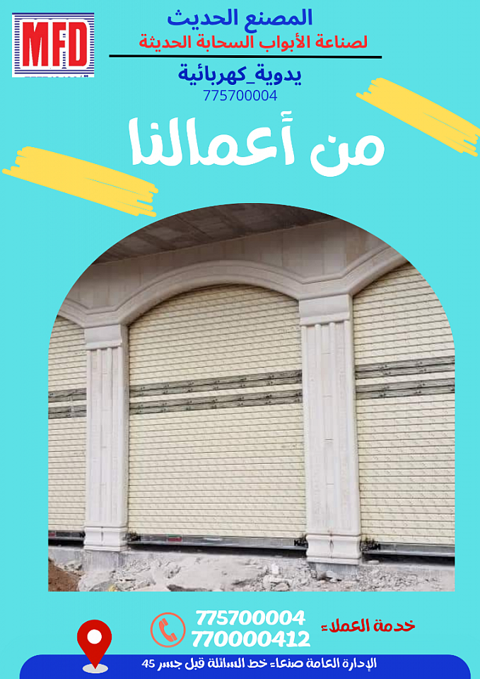 > المصنع الحديث – الخيار الأول في اليمن لصناعة الأبواب الشتر والسحاب وأبواب الكراج. نقدم أفضل الحلول العصرية للأبواب الأوتوماتيكية والكهربائية بجودة عالية وأسعار منافسة. نتميز بخبرة طويلة في صناعة الأبواب، مع فريق متخصص في التركيب والصيانة لنضمن لك المتانة والأمان وسهولة الاستخدام. أبوابنا تناسب المنازل، الفلل، الشركات، المخازن، المحلات التجارية، والدكاكين. سواء كنت تبحث عن أبواب شتر ألمنيوم عملية أو أبواب سحاب حديثة أو أبواب كراج أوتوماتيكية، فإن المصنع الحديث يوفر لك منتجات قوية مع خدمة ما بعد البيع وضمان حقيقي. 📞 للتواصل والاستفسار: